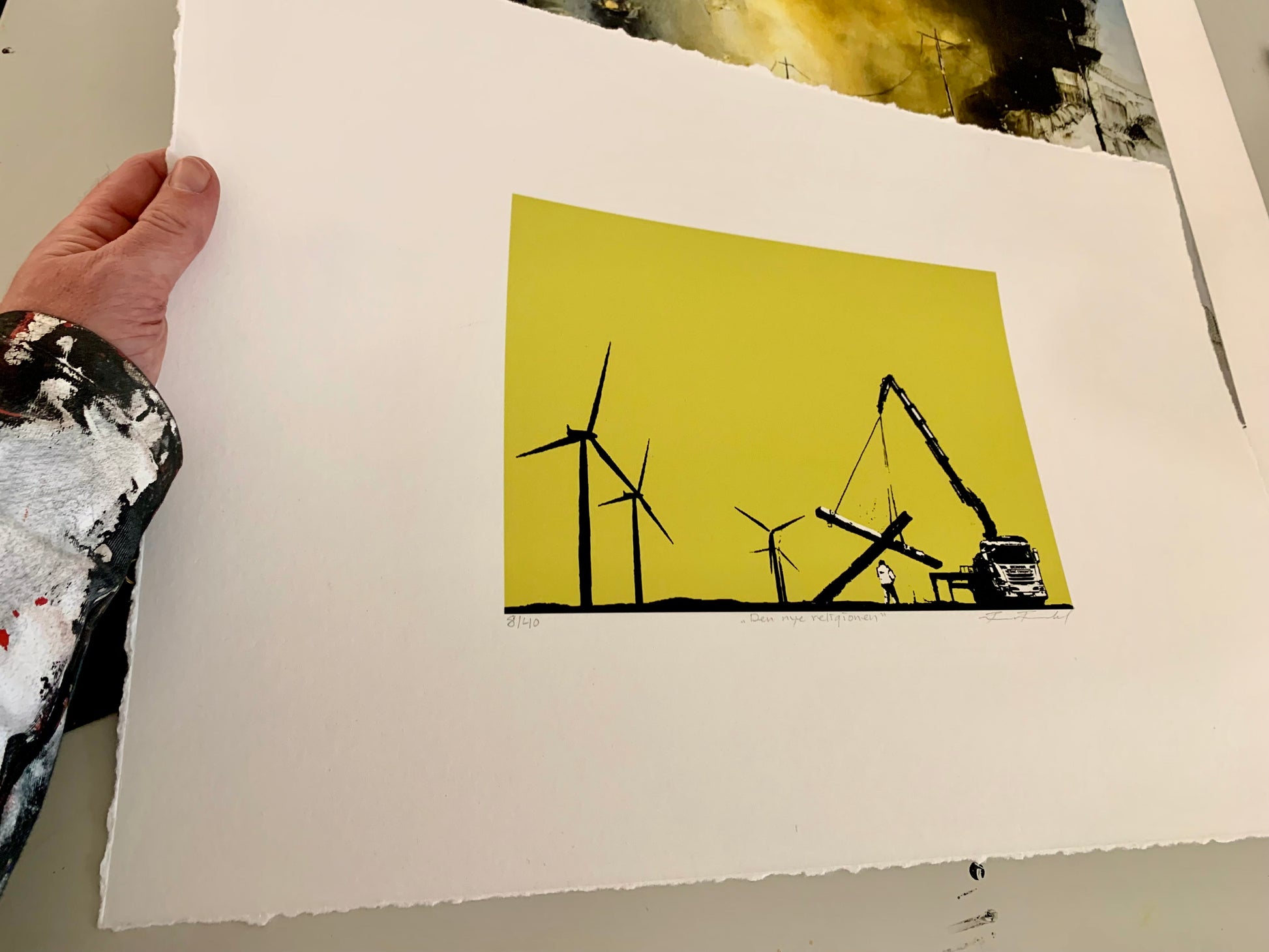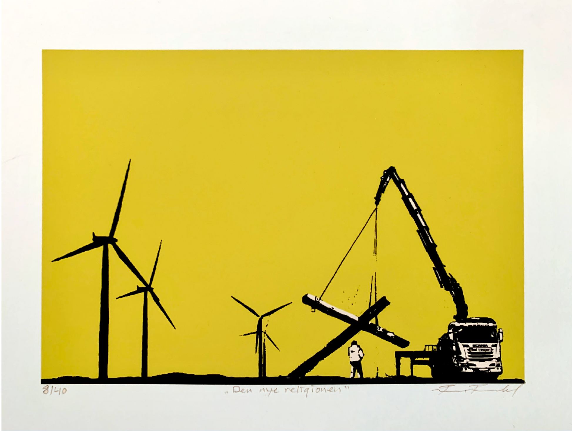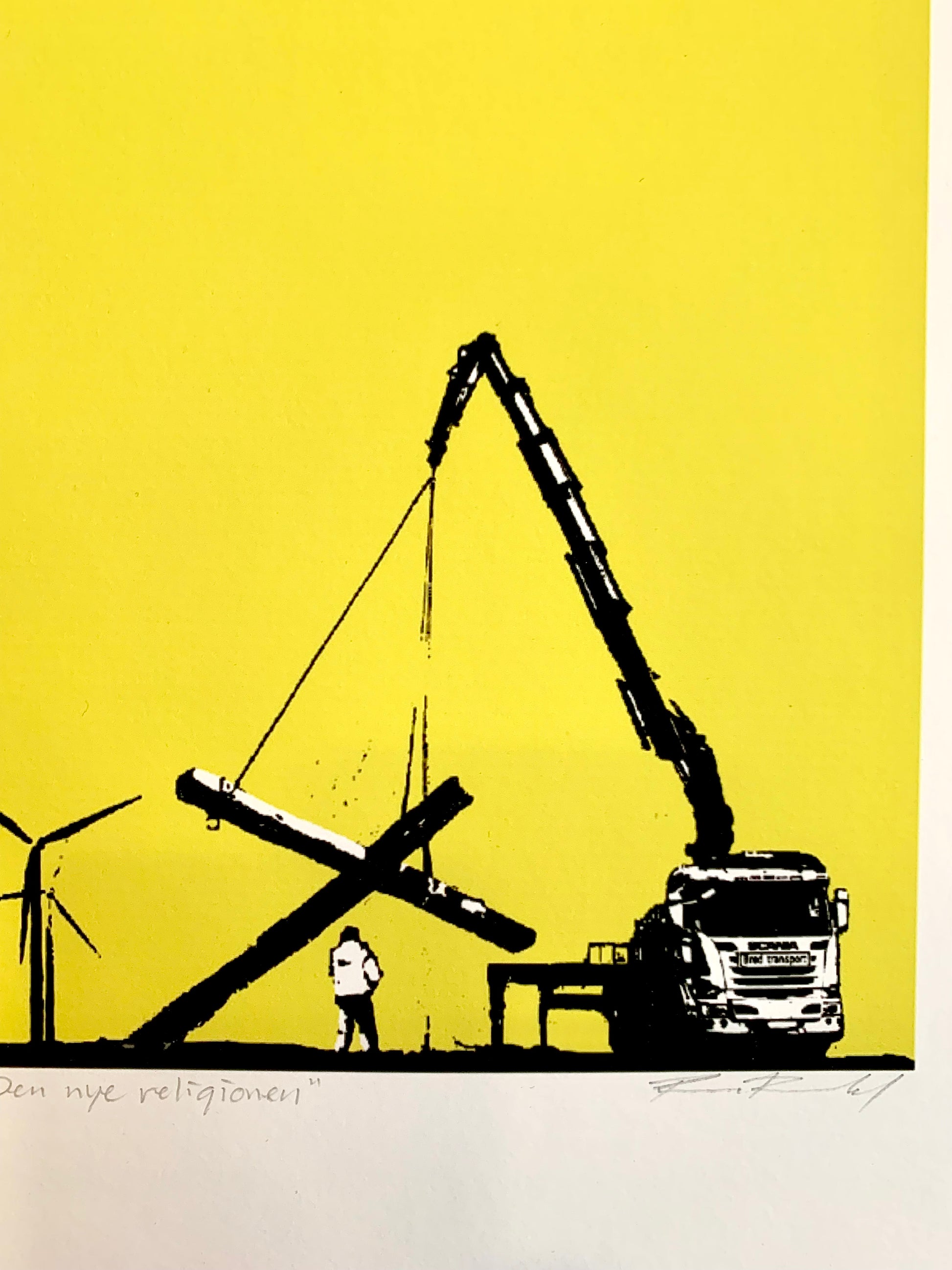 Et samfunnskritisk verk av Rune Furelid som etter å ha jobbet på en dokumentar på Haramsøya lagde dette graffiti motivet som en oppsummering på hva det grønne skiftet betyr for flere av våre landsmenn som får ødelagt sin natur samtidig som strømprisen øker og utenlandske selskaper tar pengene med seg til skatteparadis. Hever de stemmen får de beskjed om å holde kjeft for dette er det grønne skifet. Opplag 40. Teknikk: Giclee med revet kant. Hvitt yttermål: 52x36cm Motiv: 26x18cm.