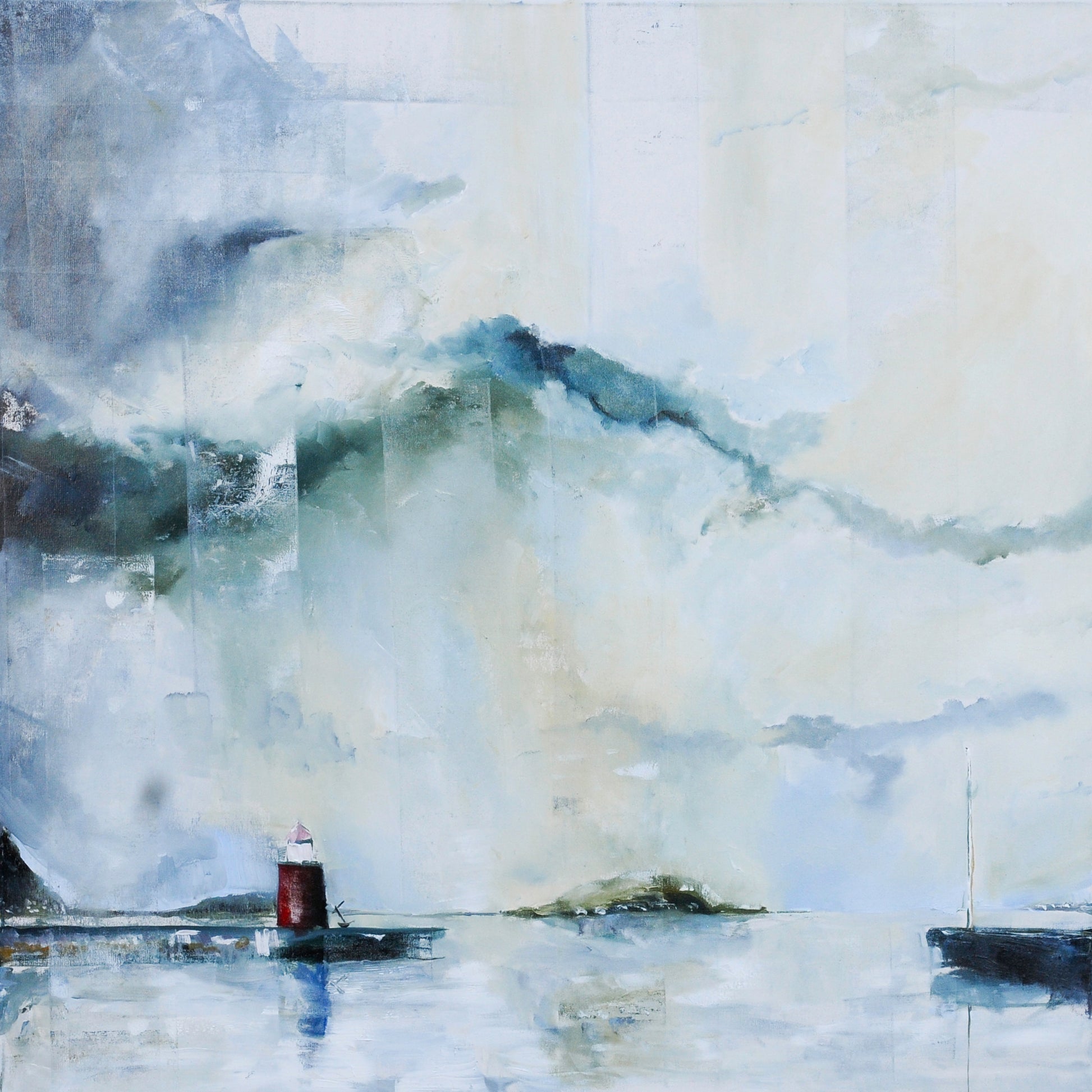 Dette er et giclée-trykk av Molja i Ålesund, 20x20 cm. Trykket fanger kystlandskapet og viser den røde fyrlykten midt i denne vakre jugendbyen.
